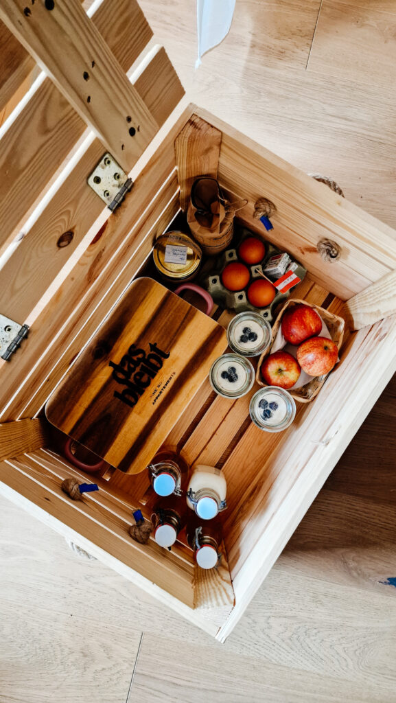 Abends darf aus der umfangreichen Frühstückskarte individuell sein Kisterl für das Frühstück zusammen gestellt werden, das zu vereinbarter Zeit leise vor der Suite platziert wird. Viele regionale Spezialitäten und hausgemachte Kreationen lassen den Tag wunderbar beginnen.