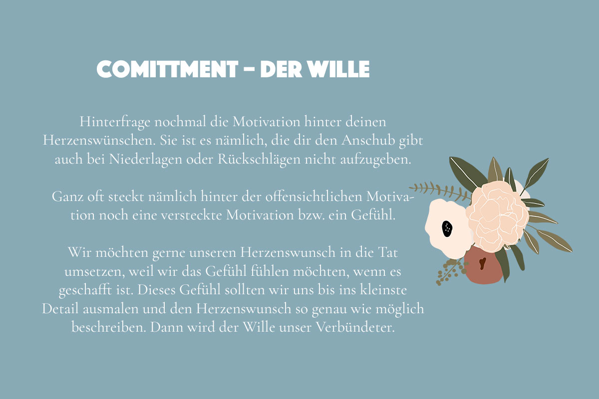 Wir können unsere Herzenswünsche finden, sie aufschreiben, ja sogar an den Kühlschrank kleben, wenn wir nicht bewusst die Entscheidung für sie treffen, wird nichts aus ihnen. Es gibt unterschiedlichste Faktoren, die uns davon abhalten, uns zu committen.
