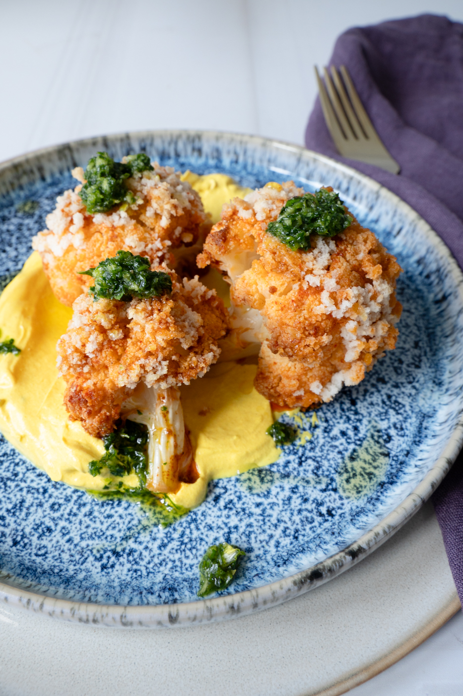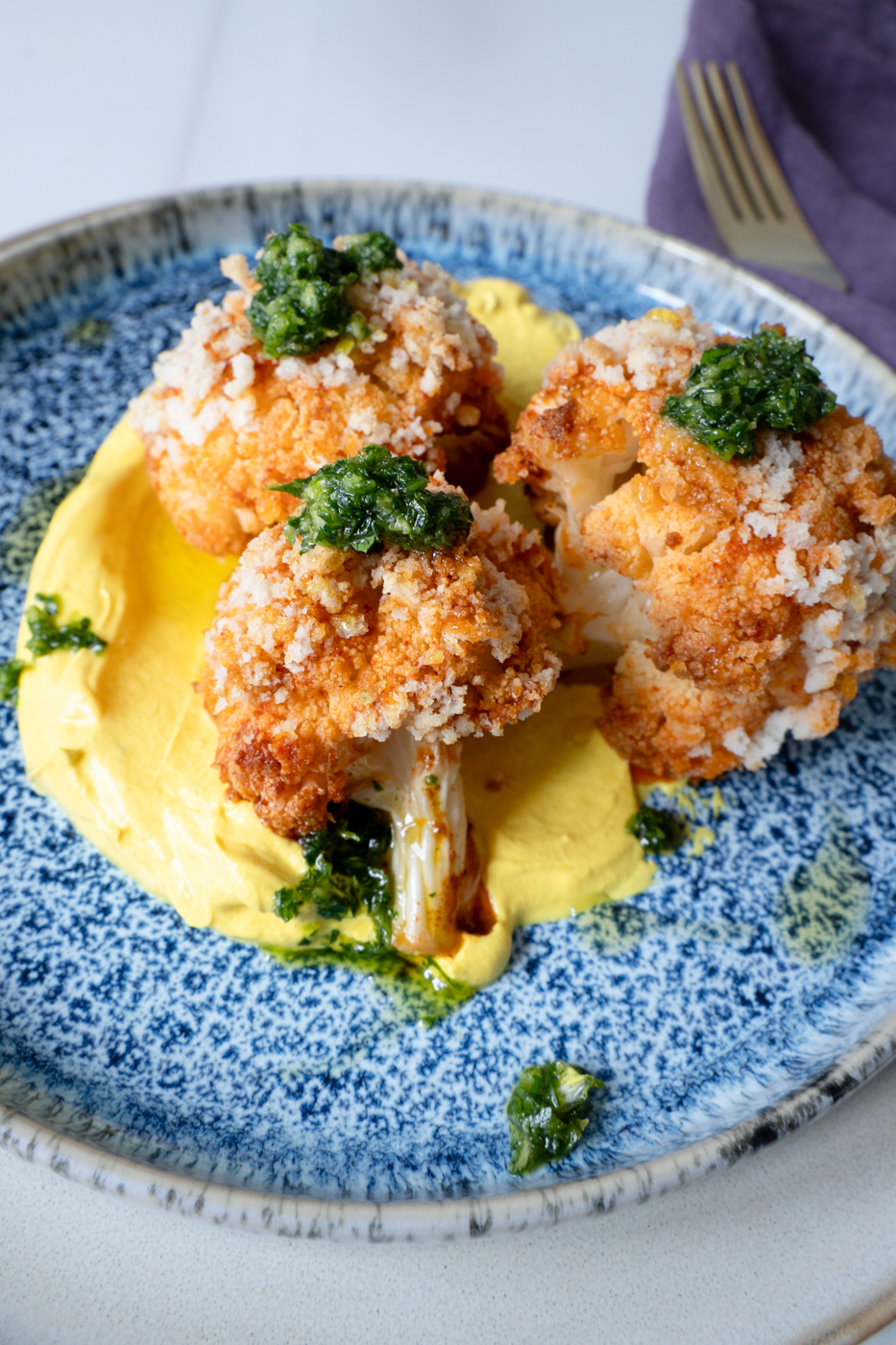 Dieser gebackene Blumenkohl ist genau so ein Gericht. Außen goldbraun und würzig, innen zart und saftig, dazu ein cremiger Curryjoghurt und ein frisches Petersilien-Dressing mit feiner Zitronennote. Kein Schnickschnack, keine komplizierten Schritte – dafür ehrlicher Geschmack pur.