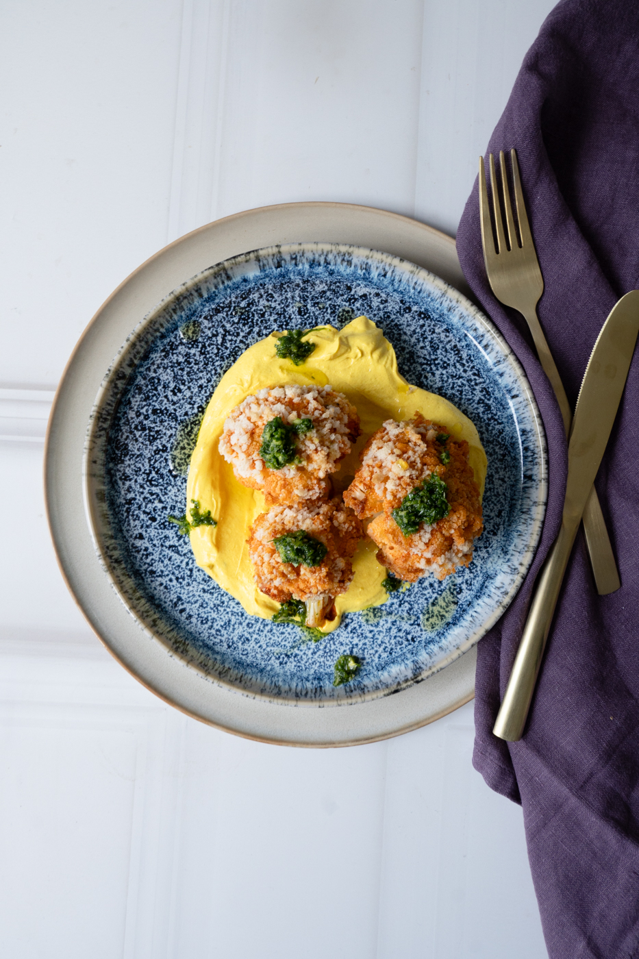 6. Das Joghurt auf dem Teller verstreichen, den Blumenkohl drauf verteilen und mit Dressing beträufeln.
