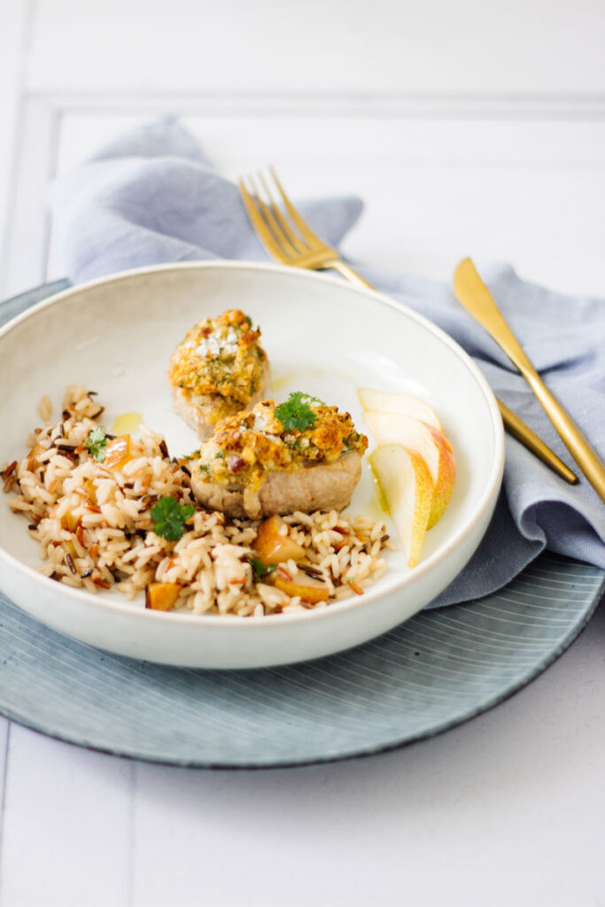 Schweinemedaillons mit Haselnuss-Kruste und wildem Birnen-Reis