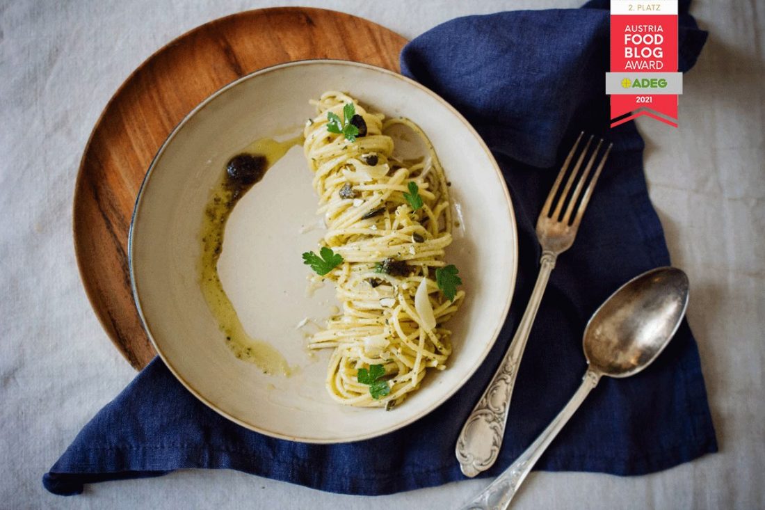 Und deshalb gibt es heute Pasta oder Nudeln, wie wir früher dazu gesagt haben. Mit feinstem Kürbiskernöl-Pesto, das bis heute fester Bestandteil unserer Alltagsküche ist.