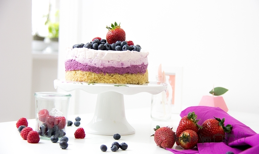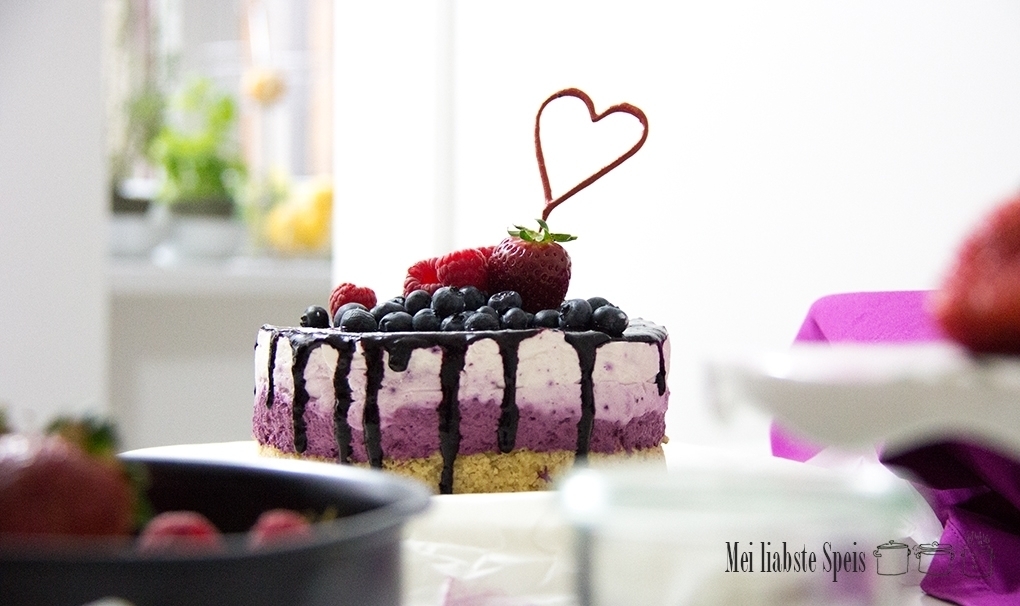 Für den Cheesecake hatte ich eine Vision, die die Blautöne der Beeren schön in Szene setzen sollte. So ganz ist es mir noch nicht gelungen, so werde ich beispielsweise das nächste Mal keine mit Backpapier ausgekleidete Springform verwenden – sie macht seitlich unschöne Abdrücke in die Creme und es gelingen auch die Übergänge nicht so wie erhofft. Wahrscheinlich hilft der pure, geölte Rand der Springform eher bei den glatten Übergängen. Also, nach dem ersten Mal ist vor dem zweiten Mal. Geschmacklich hat er voll überzeugt. Und an der Optik kann man ich arbeiten …