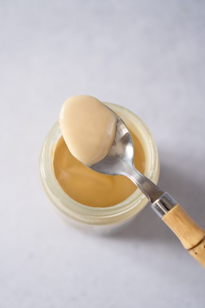 4. Alle Zutaten der Mandel-Sauce miteinander verrühren – dabei das Wasser erst zum Schluss mit einem Schneebesen einrühren und so die gewünschte Konsistenz geben.